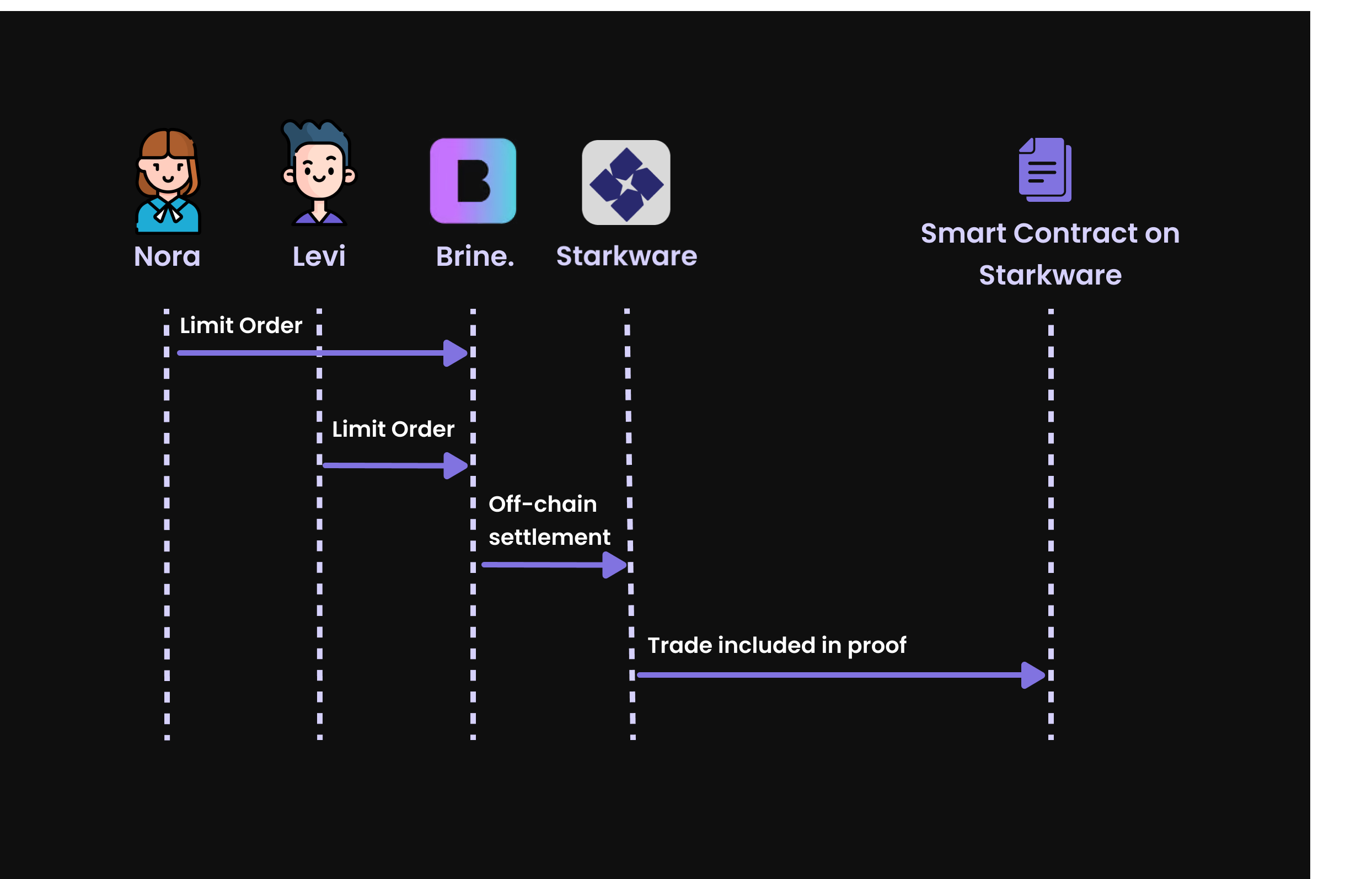 Brine matches the limit orders of Nora and Levi, and sends a settlement request transaction to the Starkware gateway, using the add_transaction API with the SettlementRequest transaction type. The API call includes both orders, including the actual amounts transferred between Nora’s and Levi’s vaults.